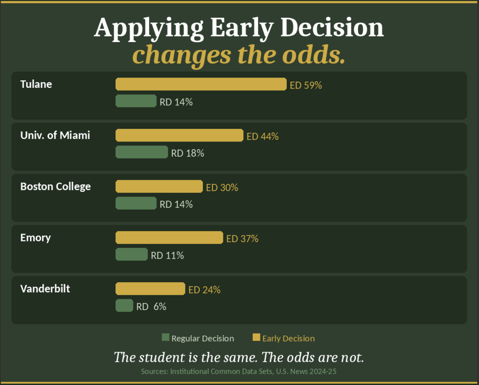 Tulane University Early Decision: 59% Regular Decision: 14% The gap: 45 percentage points. A student applying ED to Tulane is more than four times as likely to be admitted as one applying in the regular round.
